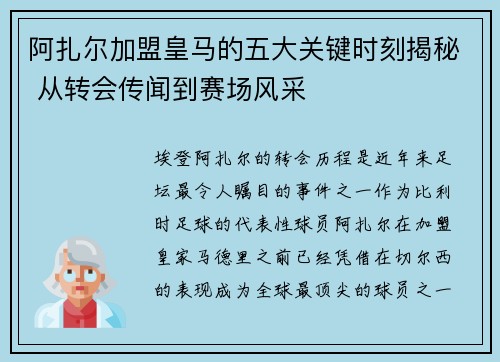阿扎尔加盟皇马的五大关键时刻揭秘 从转会传闻到赛场风采